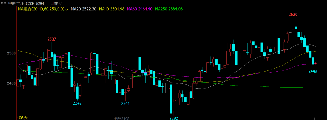 截至3月28日日内收盘,甲醇期货主力合约收盘价从前期最高点2587元/吨跌至2462 元/吨,跌幅超过100元/吨,已经走出七连跌。